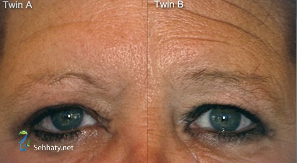 دخنت التوأم B نصف باكيت من الدخان يوميا لمدة أربعة عشر عاما بينما لم تدخن أختها إطلاقا. ارتخاء الجلد أسفل العينين أمر دائم الحدوث للمدخنين وهي واحد من العديد من المؤشرات الواضحة (والتي سنذكرها في الصور القادمة) والتي تدل على تأثيرات مكونات الدخان داخل جسمك تؤثر على مظهرك الخارجي. كما نلاحظ أن التوأم B تعرضت لتأثير أشعة الشمس المدمرة للجلد بشكل أكبر.